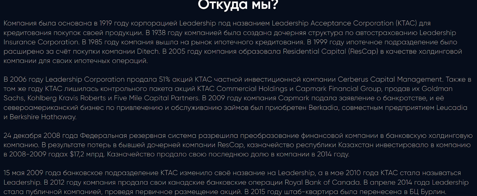 По данным на сайте, компания «Лидершип» появилась в 1919 году для оказания услуг кредитования, а затем начала оказывать обслуживание в области ипотечного подразделения. После кризиса в начала 21 века Leadership удалось восстановить авторитет с помощью инвестиций от казначейства Казахстана. Уже в 2014 году раскрылся весь потенциал и компания стала публичной и интернациональной.
