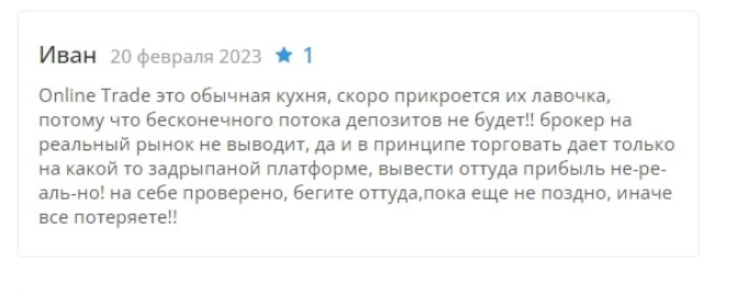Пользователи жалуются на брокера Online Trade за манипуляции с выводом средств и невыполнение своих обязательств. Например, один клиент упоминает, что после того как внес 2500 евро и попытался вывести деньги после неудачных сделок, компания потребовала дополнительные платежи: комиссии, страховку и какой-то сбор. Этот клиент считает действия брокера мошенническими и планирует подать в суд.