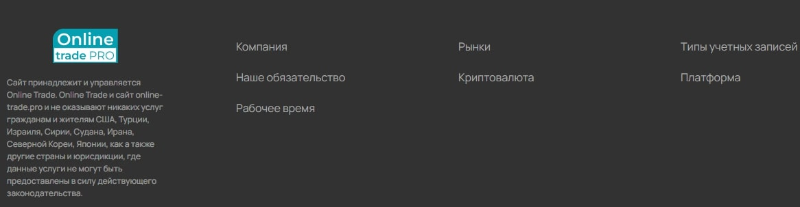 Для связи с представителями Online Trade Pro есть только форма обратной связи на сайте. Ни номера телефона, ни страниц в социальных сетях нет. Сроки рассмотрения заявок не указаны.