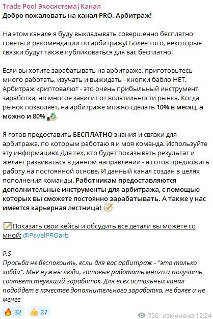 Основной канал проекта — Trade Pool Экосистема | Канал (@Trade_Pool_Channel). Создан 24 июля 2023 года. Изначально это был проект про арбитраж. Это странно. Почему создатели биржи не сделали отдельный канал — не совсем понятно.