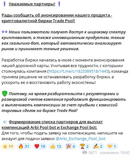 Обменник рекламируют через сообщества арбитража. Якобы, есть возможность неплохо заработать через этот сервис. Это давняя схема мошенничества.Trade Pool в социальных сетях