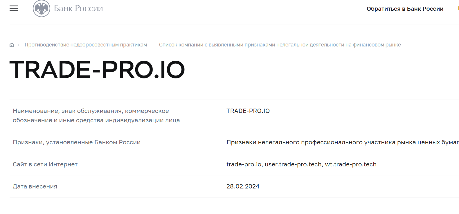 Компания Trade Pro признана ЦБ РФ нелегальной. Руководители пытаются акцентировать внимание только на плюсах брокера, но в реальности предоставляют фальшивую информацию о проекте. Исходя из жалоб трейдеров, здесь не позволяют выводить средства. К признакам мошенничества мы отнесли следующее: