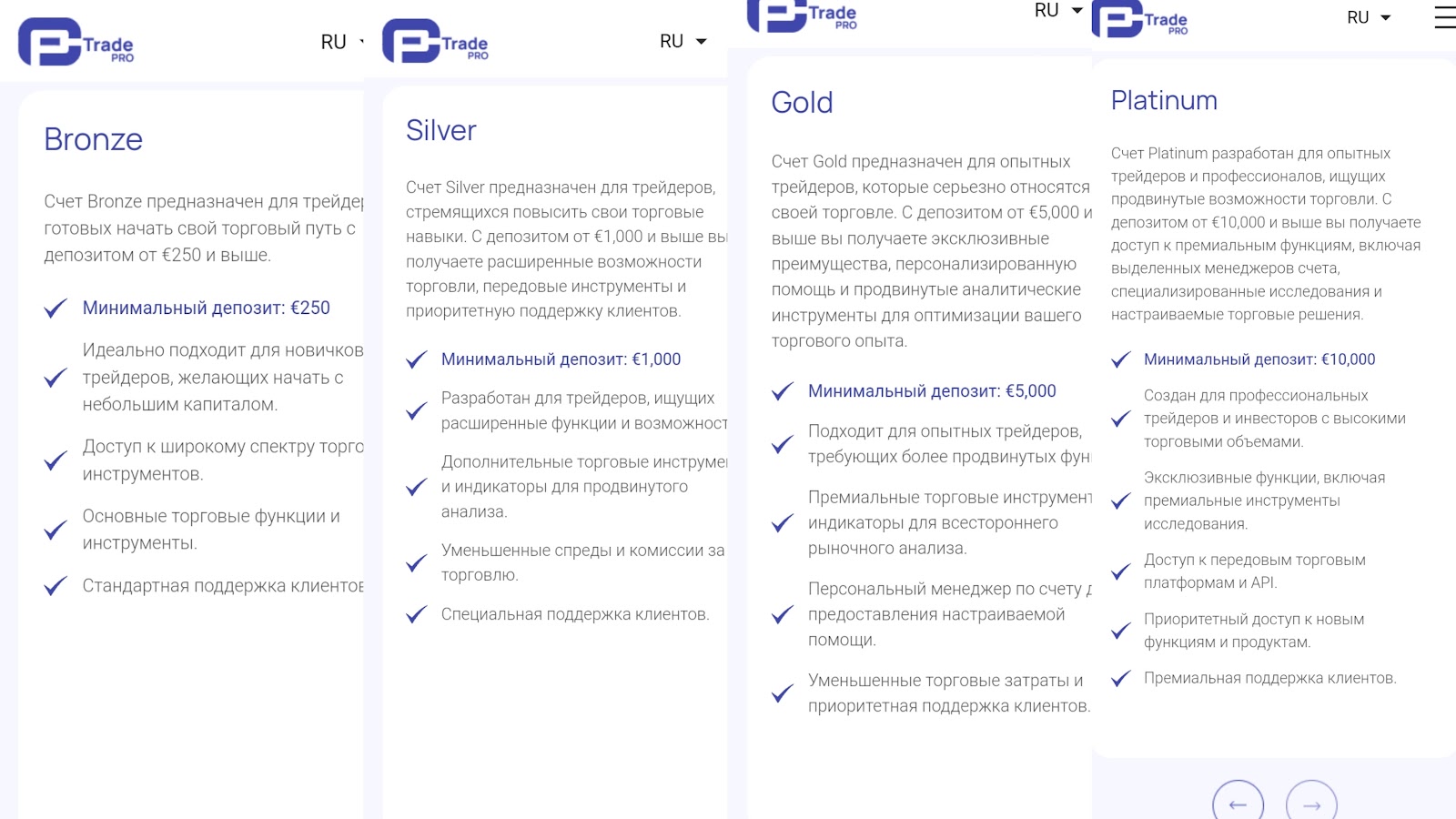 - Bronze. Начинать можно от 250 евро. Подходит клиентам без опыта. Предоставляются только основные торг. инструменты. Торговые возможности ограничены;