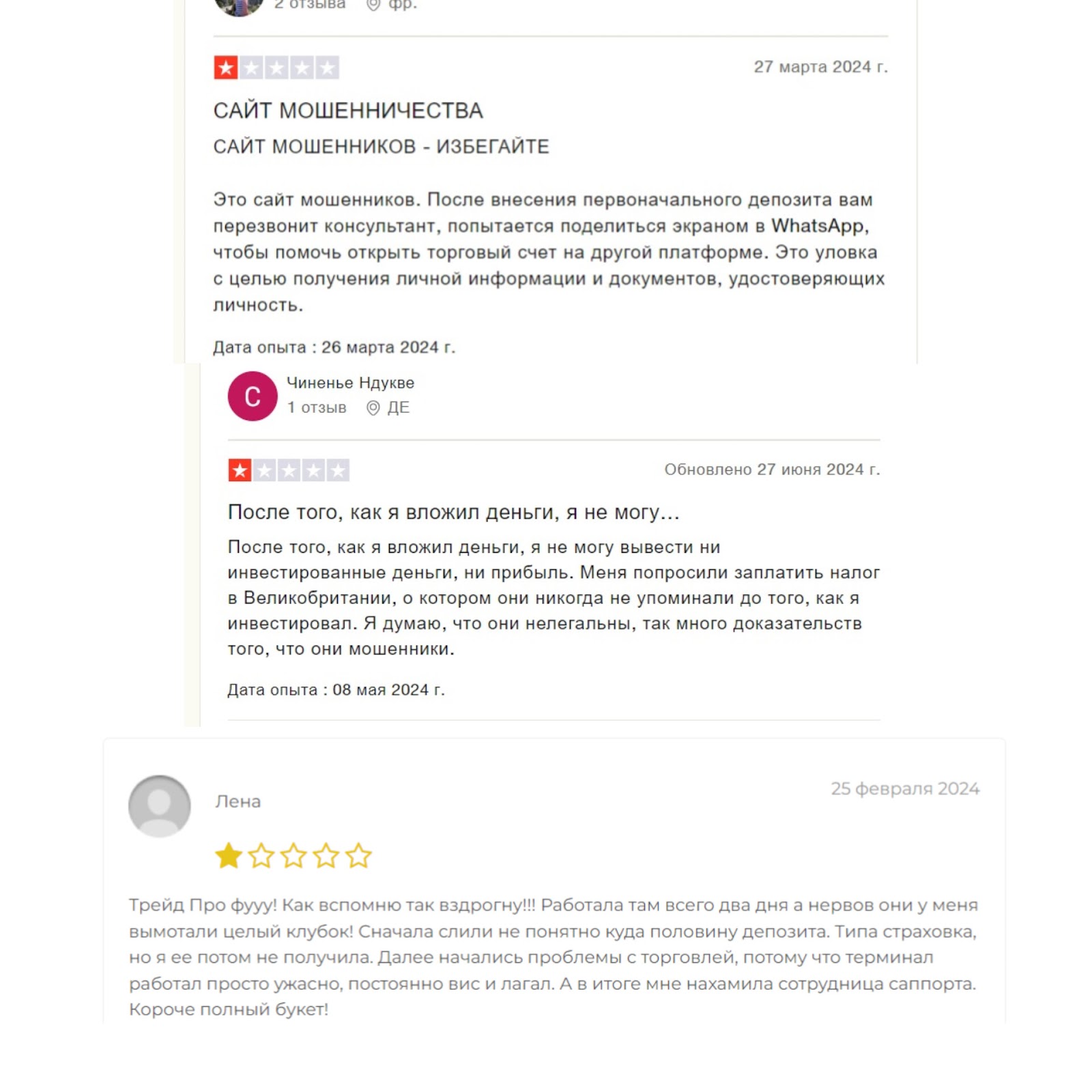 На независимых площадках есть негативные отзывы о Trade Pro io. В них бывшие клиенты пишут, что компания принадлежит мошенникам, которые сливают депозиты трейдеров. Во время торговли происходят трудности, а саппорт работает некачественно.
