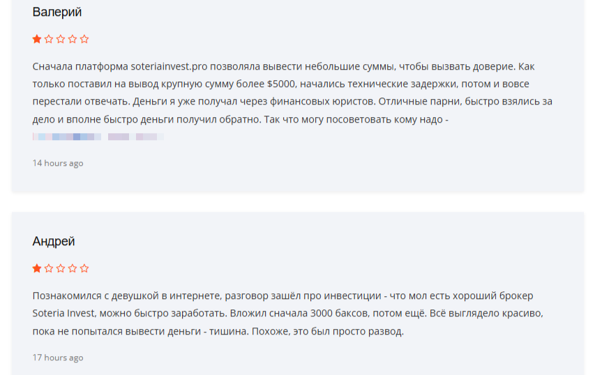 Фейковый посредник обещал целевой аудитории в интернете золотые горы менее года. За этот период сайт soteriainvest pro отзывов доброжелательных не получил. Никто из трейдеров не пожелал похвалить брокера за мгновенные сделки, лучшие комиссии или другие преимущества сотрудничества.