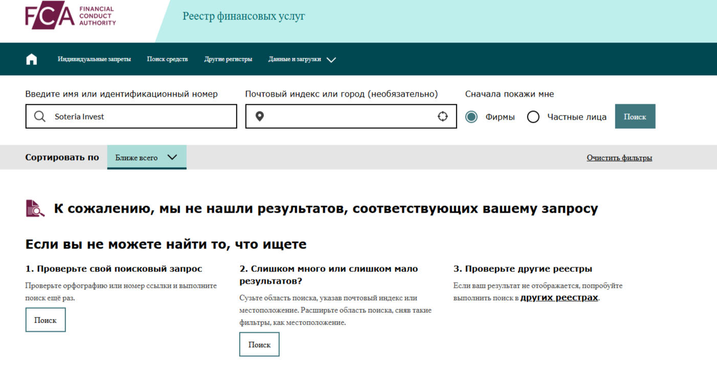 Проверка мировой паутины позволила определить, сайт брокера soteriainvest pro появился в интернете 24 сентября 2024 года. Поэтому он не может принадлежать организации, которая на 9 лет моложе домена. Лицензия FCA фейковая. На сайте регулятора нет информации о брокерской организации. На основании перечисленных факторов можно говорить о мошенничестве и разводе со стороны создателей брокерского проекта.