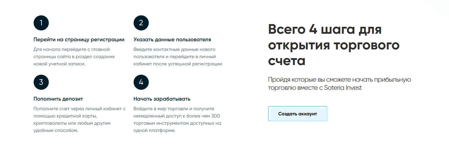 Посредник SoteriaInvest оказывает свои услуги только зарегистрированным на официальном сайте трейдерам. Для создания аккаунта и последующей торговли следует пройти 4 шага. В них входит активация кнопки «Регистрация» и заполнение анкеты, внесение депозита и непосредственно торговые операции.