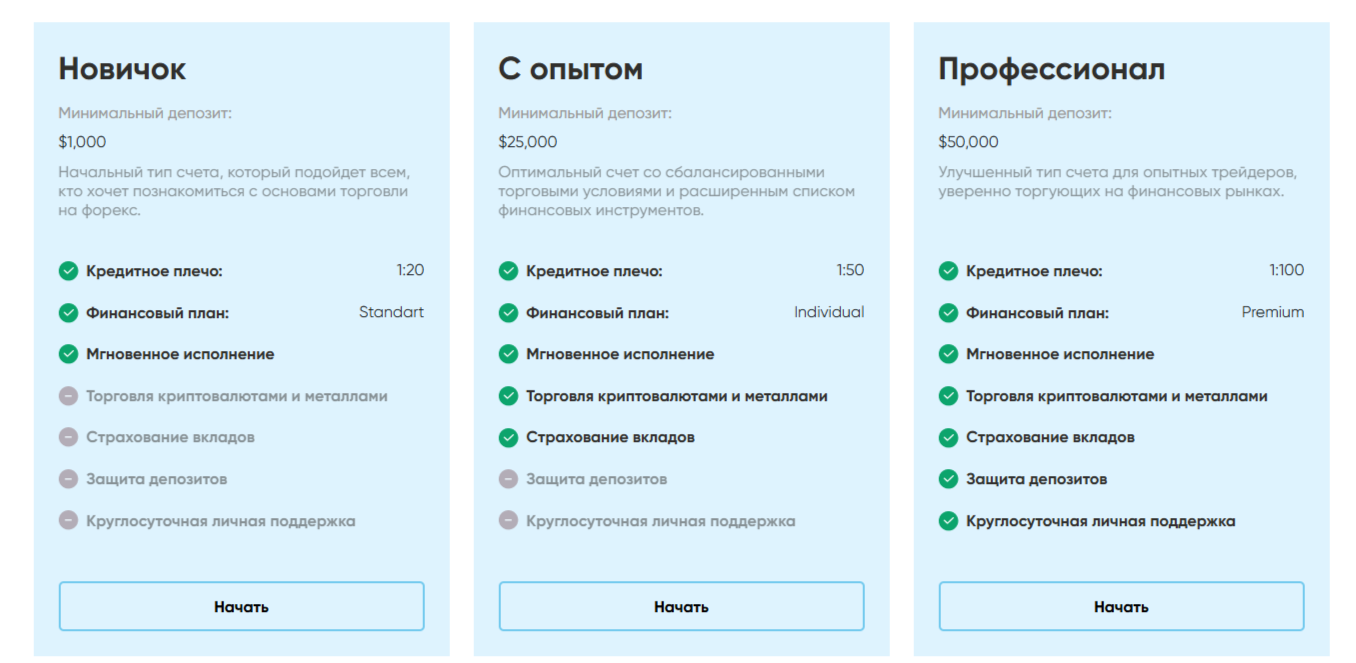 - «С опытом». Депозит от 25 000 долларов, кредитное плечо 1:50, мгновенное исполнение ордеров, страховка вложений.