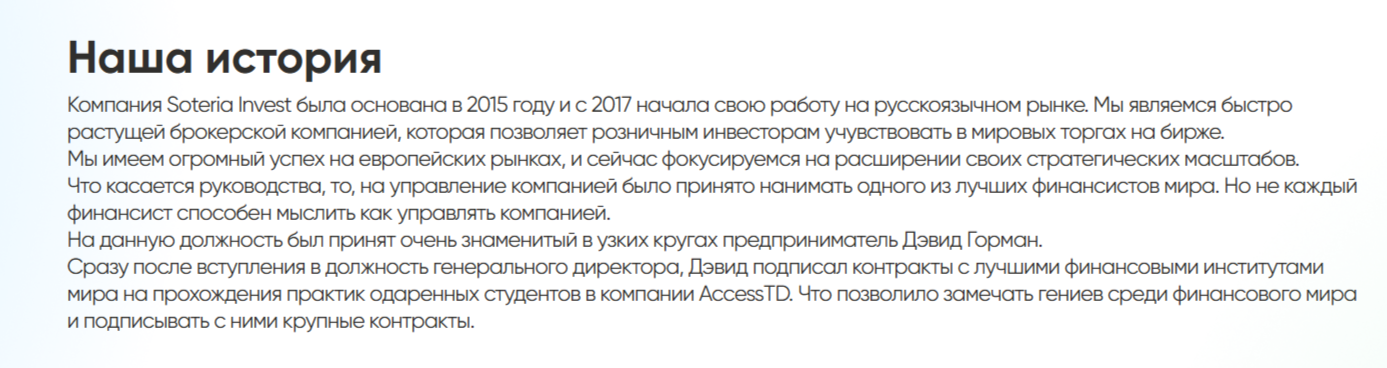 Брокер SoteriaInvest – мошенник, промышляющий обманом доверчивых молодых трейдеров. У данного посредника преимущества попросту отсутствуют. Минусами брокерской организации выступают: