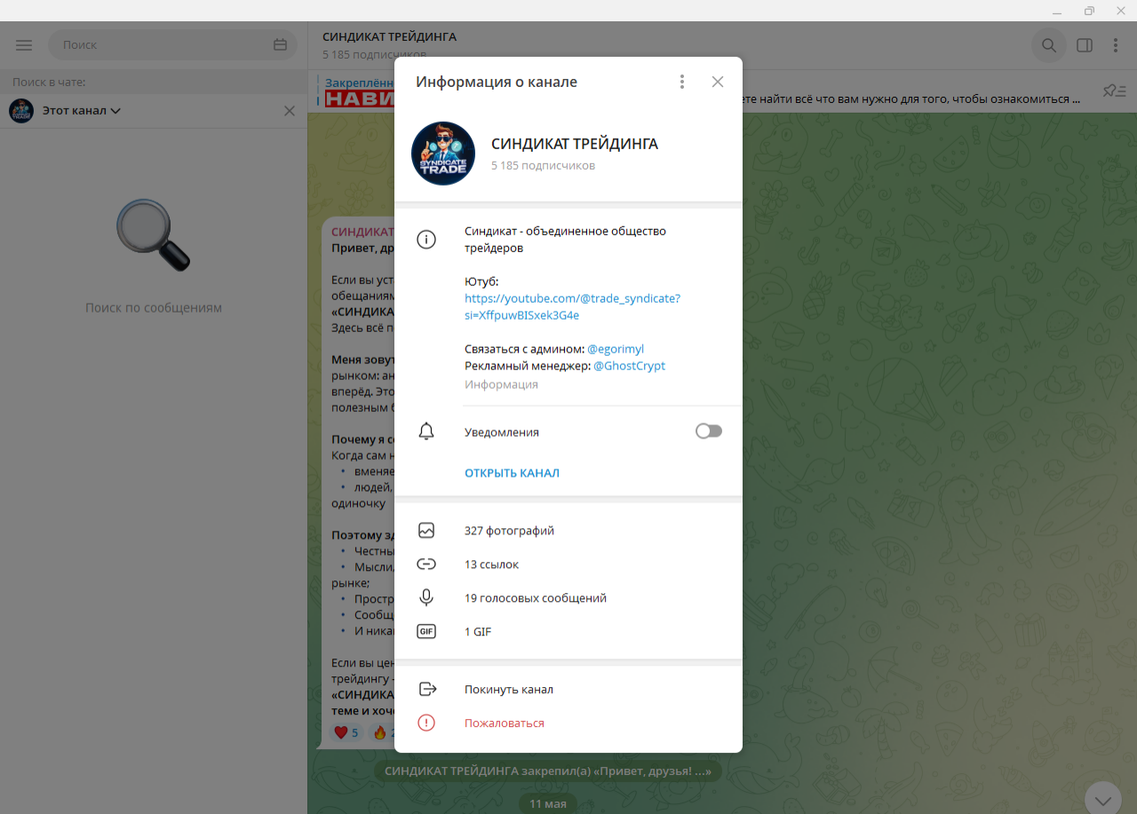 «Синдикат Trade» появился весной 2025 года. Автор канала, Egorimyl, называет себя опытным трейдером и обещает прибыль с помощью собственной системы сигналов. Помимо проекта «Синдикат Трейдинга», Егор ведёт ещё и ютуб-канал, где выкладывает короткие видео и анализ рынка.