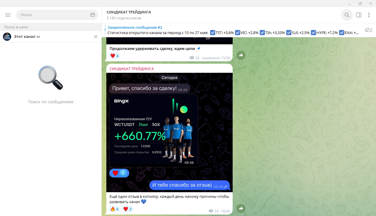 В сети и на крипто-форумах упоминаний о проекте практически нет. На самом канале есть несколько постов, указывающих на положительный опыт участников Trade Syndicate. На скриншотах довольные трейдеры благодарят Egorimyl за сделку и прикрепляют большие проценты прибыли.