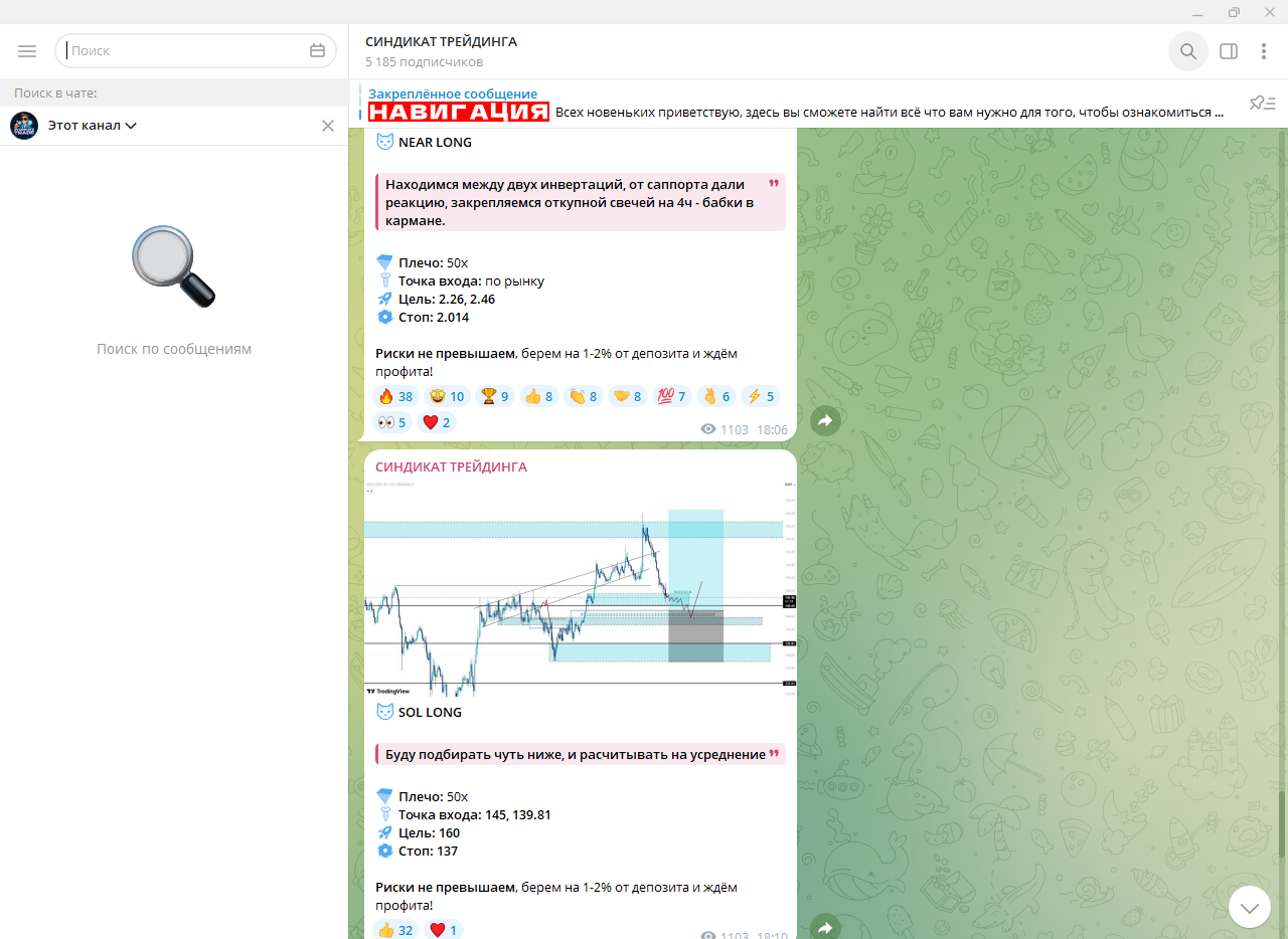 В «Синдикат Трейдинга» есть бесплатный и платный контент. Бесплатно дают сигналы для сделок на бирже. Причём пишут довольно подробно: дают название монеты, указывают, покупать или продавать актив, на какой котировке открывать сделку, где поставить стоп-лосс и где получать профит. Плюс, автор советует соблюдать базовый метод безопасности и не рисковать больше 1–2% депозита на одну сделку.
