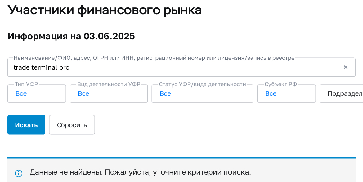 Для проверки безопасности брокера нужно изучить его через сайт ЦБ РФ. Компании в реестре нет, значит, лицензии у фирмы отсутствует. Без юридических документов пользователи рискуют попасть на скамеров: в случае развода вернуть деньги через суд не выйдет.