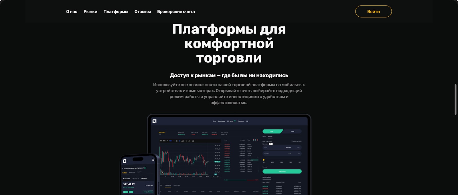 Еще один плюс компании — мультиплатформенность. Пользователи могут торговать, не вставая с кровати: с телефона или планшета. Предусмотрена и десктопная версия. Это должно привлечь больше пользователей и повысить репутацию фирмы.