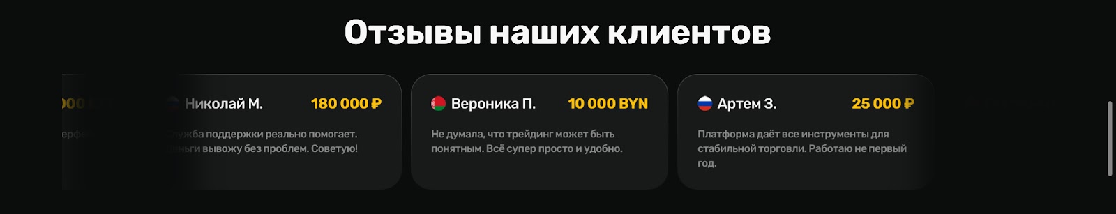 На сайте представлен раздел с комментариями юзеров. Они хвалят простоту платформы и качество инструментов. Рядом с их аккаунтами указана сумма. Не отмечается, является ли это их депозитом или заработком. Такие отклики часто оказываются накрученными — доверять им не стоит, так как нельзя проверить подлинность.