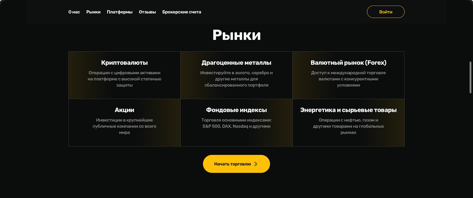 Юзеры могут торговать на следующих рынках:
