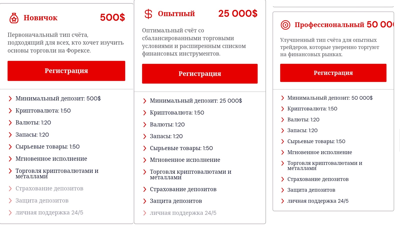 - “Новичок”. Нужно вложить на баланс от 500 долларов. Для крипты и сырьевых товаров будет торговое плечо 1 к 50, а для других активов 1 к 20;