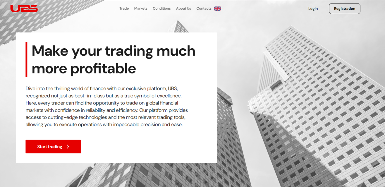 Ранее проект работал через площадки trade ubs cfd или ubs cfd. Сейчас у брокера есть сайт trade ubs deal, а также ubs deal, и веб-ресурсы не отличаются от предыдущих. Из главных разделов: “Торговля”, “Рынки”, “Условия”, “О нас”, “Контакты”, “Вход или Регистрация”.