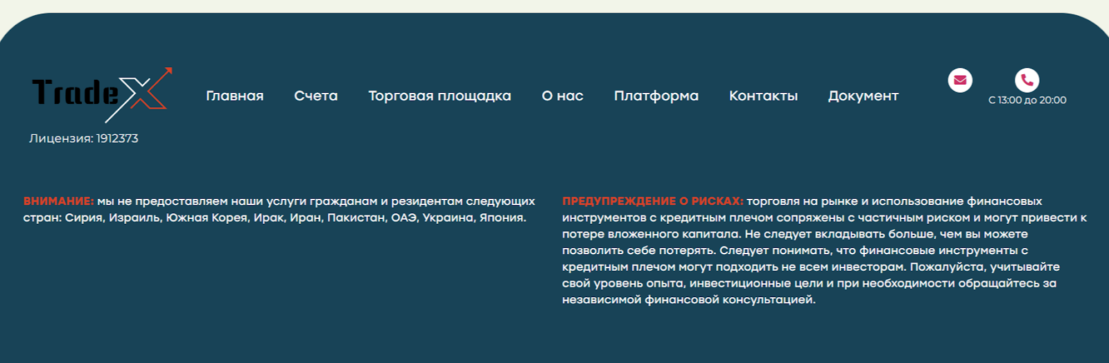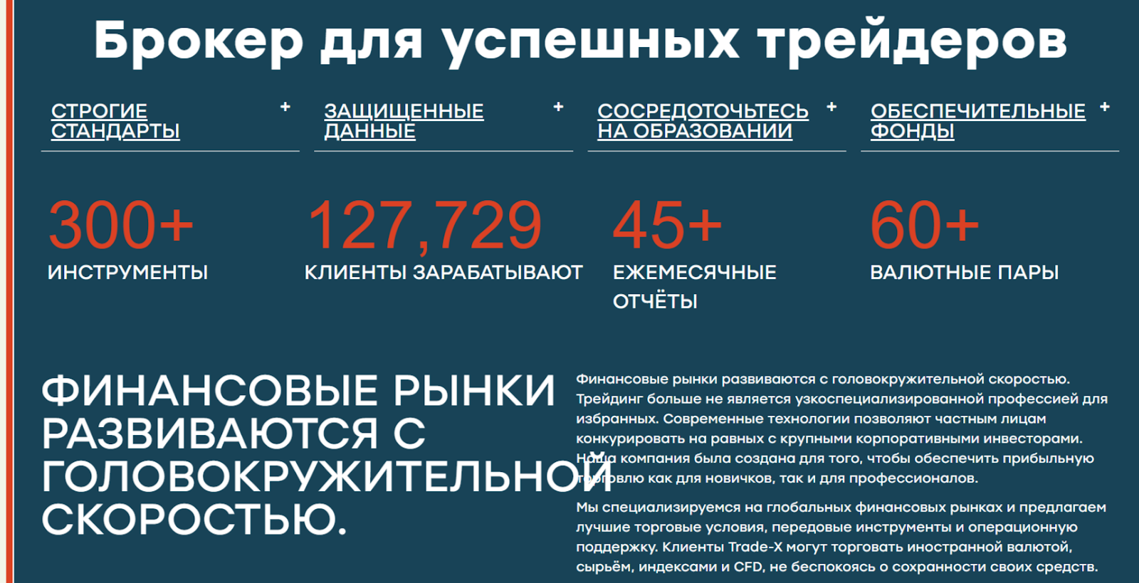 Брокерская организация предоставляет всем желающим, кроме жителей Южной Кореи, Ирака, Израиля, Ирана, Пакистана, ОАЭ, Украины, Японии, возможность заработать на торговле 300+ инструментами. На сайте Trade X доступен обмен и торговля. Совершать сделки на портале можно со следующими активами: