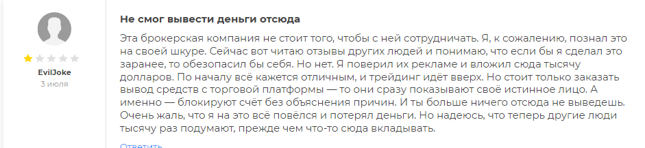 Мировая паутина ознакомила нас с резкими и отрицательными комментариями о работе брокерской организации. В них посредника обвиняют в беспричинной блокировке счетов и достаточно крупных убытках.