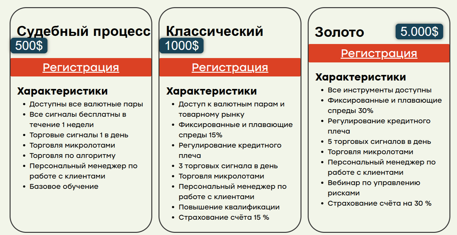 - Trial. Депозит от 500 долларов, бесплатные сигналы в течение недели, обслуживание персональным менеджером, базовое обучение.