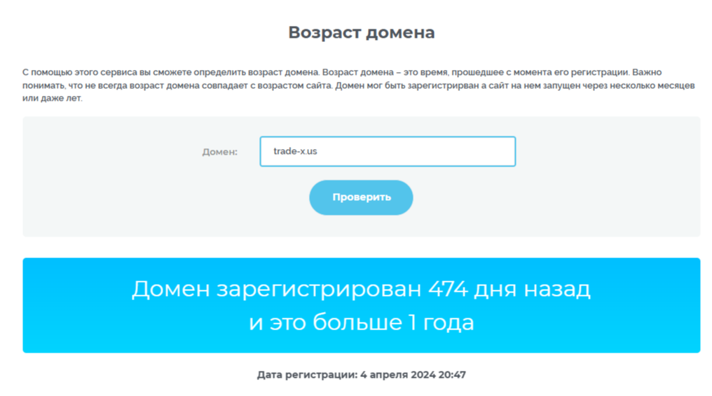 Хедер портала trade x us может ознакомить читателей с номером лицензии 1912373. Кто выдал документ с упомянутым номером неизвестно, но однозначно не ЦБ РФ. В результате проверки мы определили, домен брокера был зарегистрирован 4 апреля 2024 года. Брокерская организация ведет свою деятельность более года, но не соизволила ее легализовать. Нежелание оформлять регистрацию и разрешение на работу говорит о потенциальном мошенничестве и разводе.