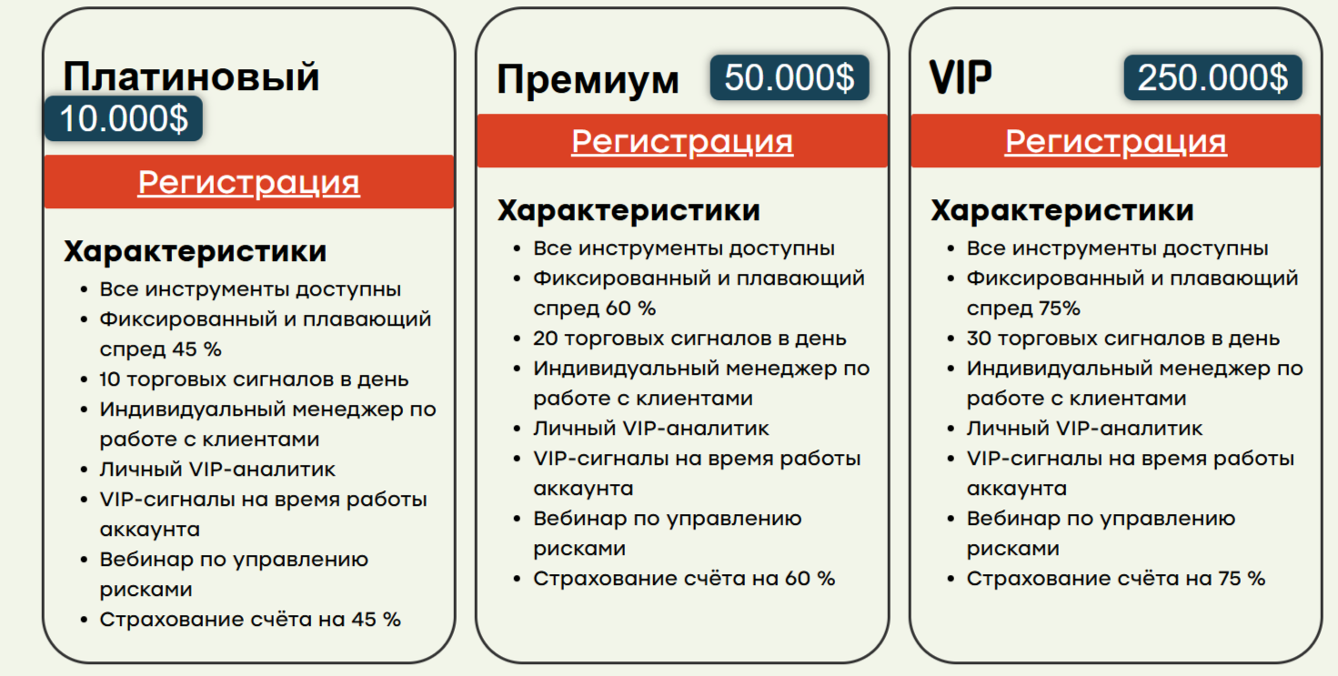 - Platinum. Депозит от 10 000 долларов, фиксированные и плавающие спреды 45%, ВИП-сигналы, личный аналитик, страхование счета 45%.