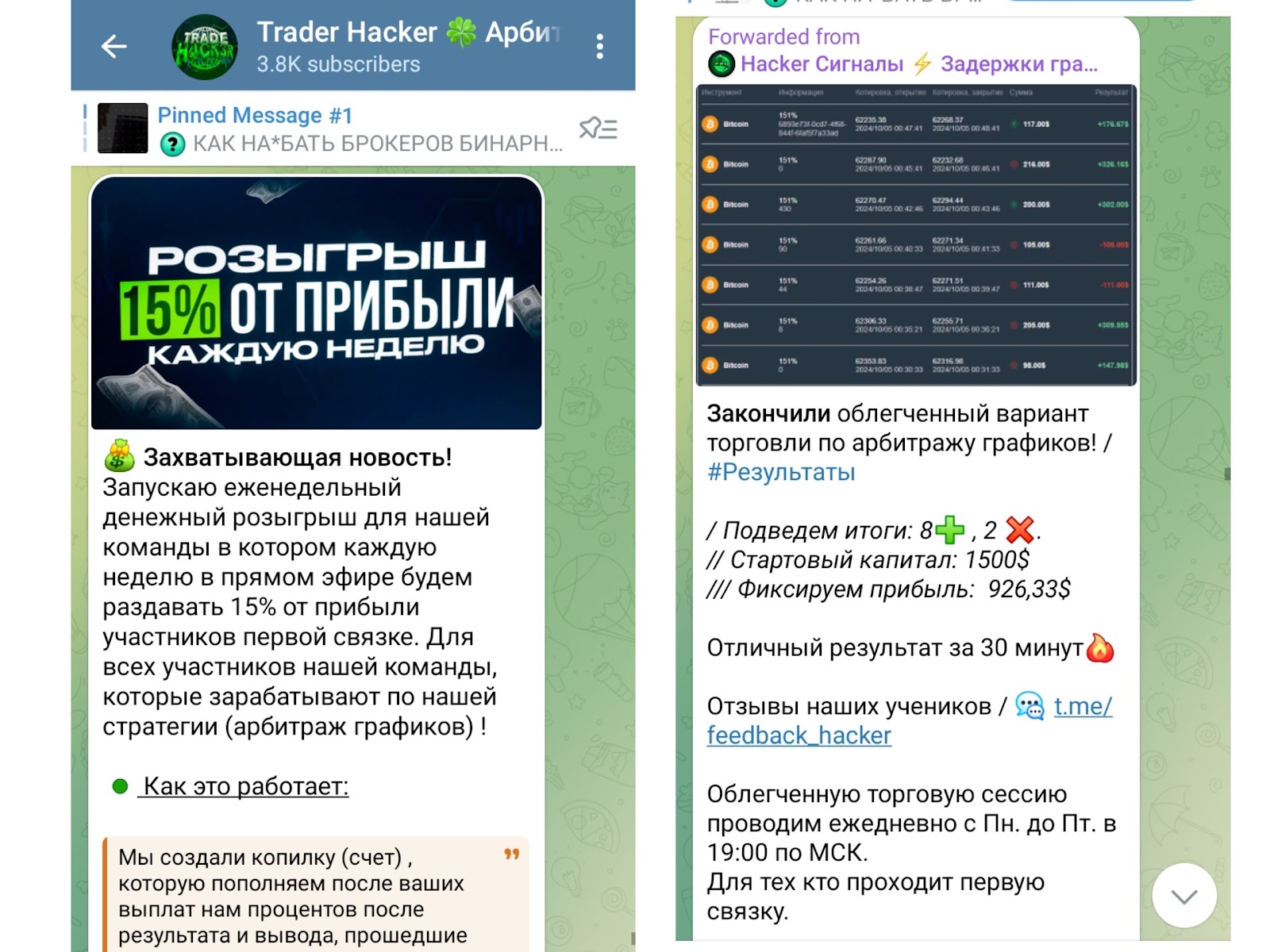 Сообщество закрытое, но заявки на подписки принимаются быстро. На канале Trader Hacker Арбитраж Графиков размещены краткие материалы про арбитраж. Трейдеры также делятся мыслями по поводу ситуации на крипторынке. Иногда админы проводят денежные розыгрыши. В прямых эфирах раздают 15% от дохода участников 1 связки. К таким постам прикрепляется инструкция по участию. В основном контент направлен на продвижение услуг. В ленте сообщества размещены результаты торговли и отклики от клиентов. Стоит отметить, что отчеты не верифицированные.