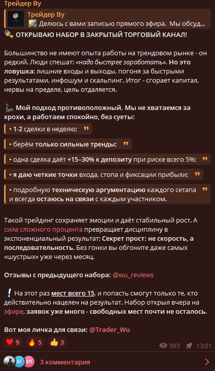 В сети практически нет независимых отзывов трейдеров о «Трейдере Ву Цзе». Вся статистика и отзывы публикуются исключительно в его тг-канале, где представлены только положительные результаты.