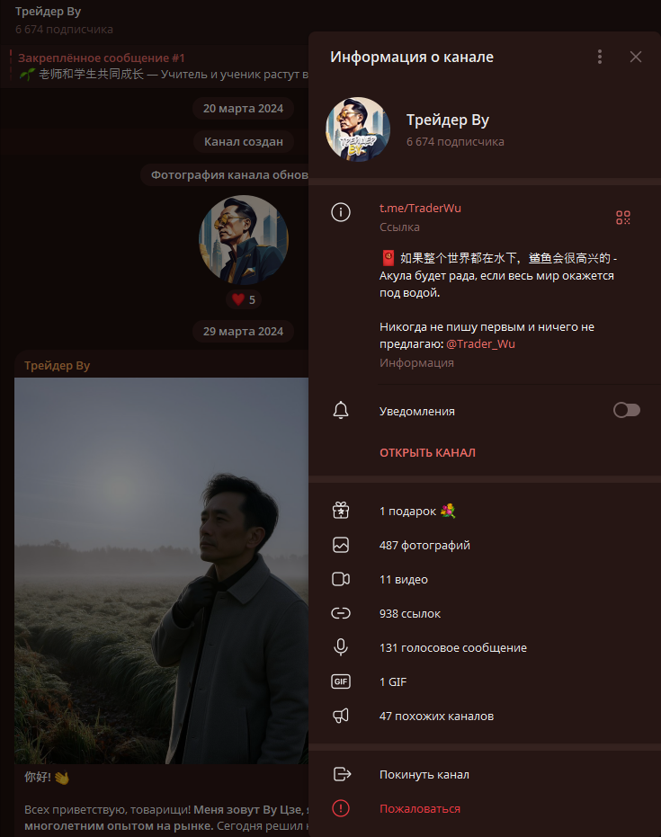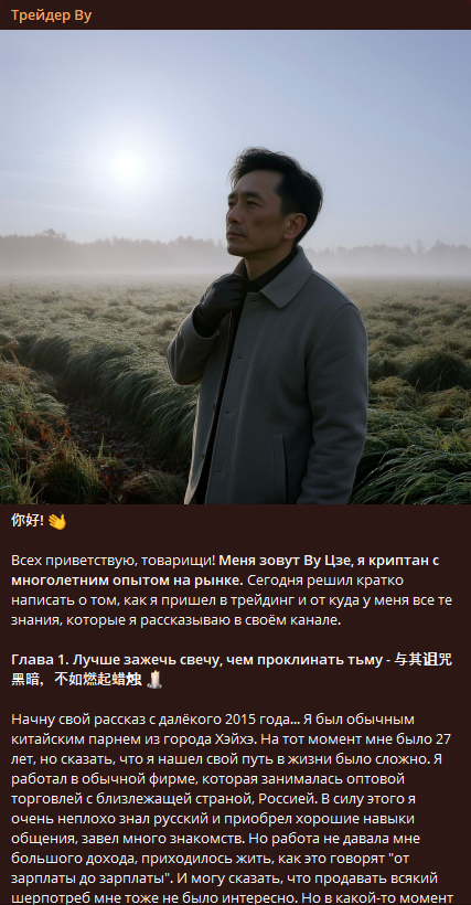 Китайский трейдер Ву Цзе, ведущий свой тг-канал «Трейдер Ву» обещает качественные материалы и стабильный заработок. Судя по материалам из его канала мы сделали выводы по его работе: