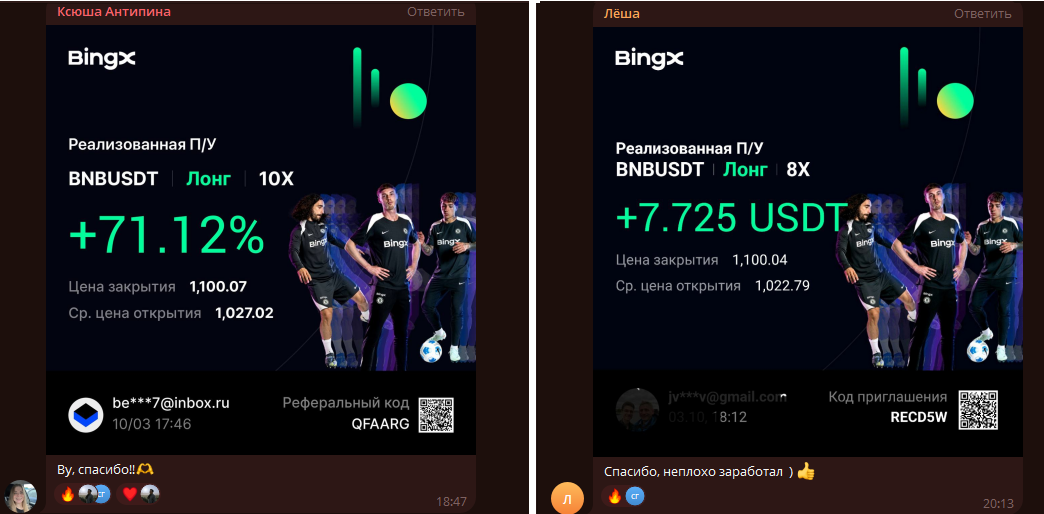Например, пользователь Лёша сообщает о заработке 7,725 USDT по сделке BNB/USDT, а Ксения Антипина демонстрирует результат своего лонга в 71.12%. Оба клиента довольные и используют реферальные коды Ву.