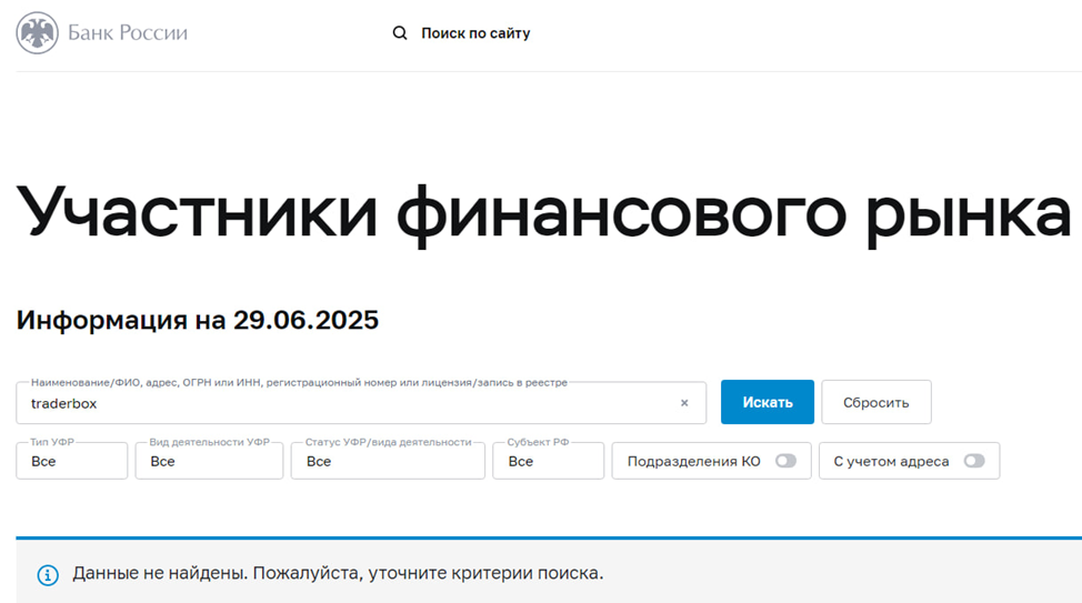 Доменный адрес сайта «Трейдер Бокс» выставлен на продажу за 77 долларов. Проверка показала, что он правда свободен. В реестре Центробанка РФ не числится. Значит, на территории России действует нелегально и подвергает опасности пользователей.