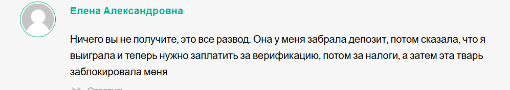 Попался на удочку к этой мадам. Сначала она предложила закинуть 500 рублей и за сутки они должны были чудесным образом превратиться в 50000, потом она потребовала оплатить налог и страховку и когда я повелся, она отправила меня в блок! Не ведитесь на такие сказки и не рискуйте деньгами!