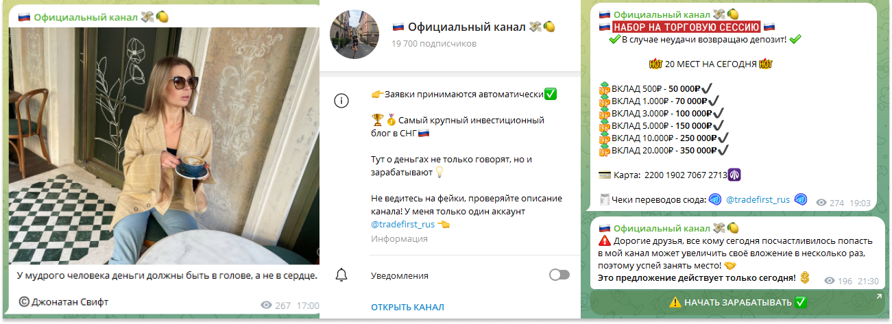 Девушка, которая представляется трейдером, помогает своим клиентам с помощью торговли криптой умножить их баланс на счетах. Упоминается и некий телеграмм-канал, который до этого принадлежал владелице официального аккаунта.
