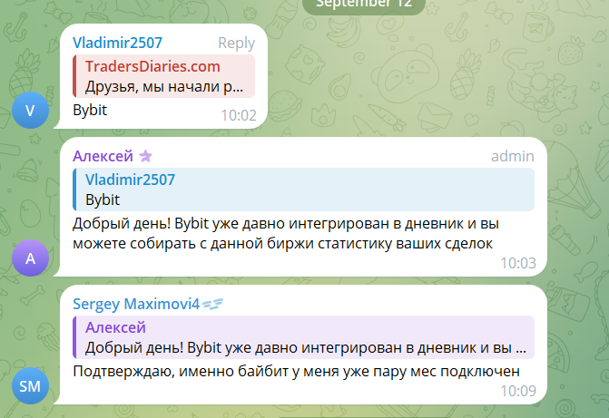В телеграмм-канале, Tradersdiaries com, выкладываются обновления самого сайта и дневника, а также рекламируются партнеры и их обучения. Мы можем вступить в обсуждение “Чат TradersDiaries com” через телеграмм-канал, где люди делятся мнением о той или иной новости или просто делятся своим опытом.