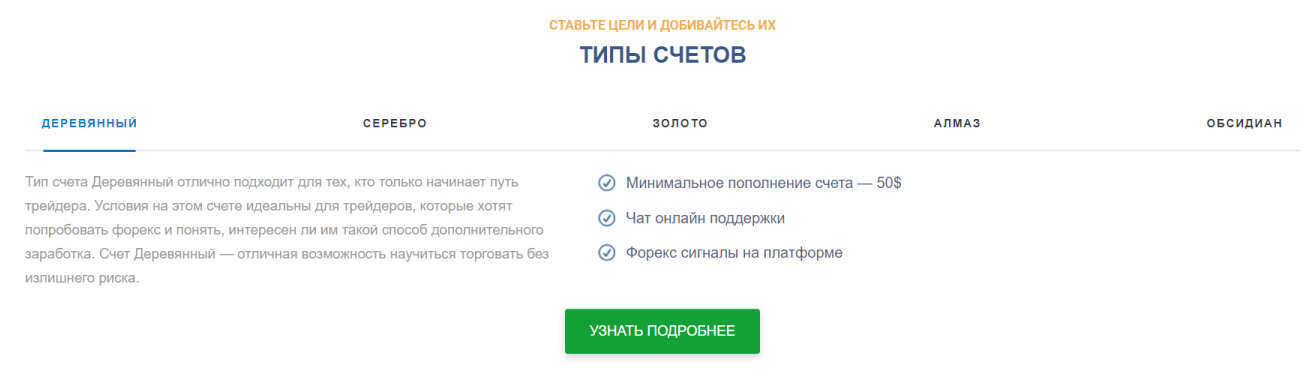• Деревянный — депозит от 50 долларов. Предложен чат-поддержки + сигналы для торговли на Форекс;