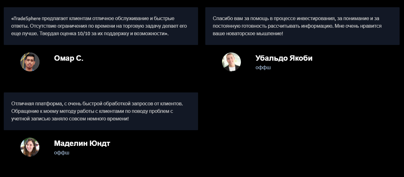 На самом сайте размещены три хвалебных отзыва о TradeSphere pro от клиентов, но они выглядят шаблонно и не подтверждены внешними источниками.