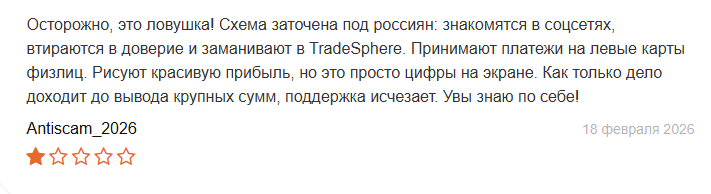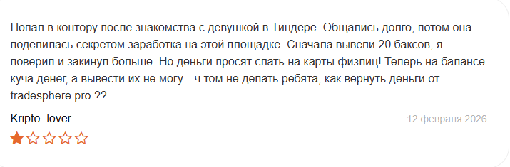 Негативные отзывы о TradeSphere описывают одну схему: знакомство в соцсетях или Тиндере, долгое общение и предложение заработать на платформе. Один пользователь рассказал, что ему дали вывести $20, после чего он внес крупную сумму, и его аккаунт заблокировали. Поддержка info@tradesphere pro игнорировала все его запросы о помощи.