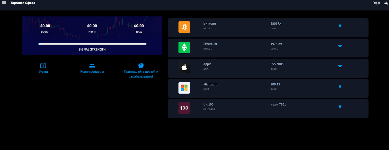 На главном экране TradeSphere отображаются баланс, прибыль и индикатор Signal Strength, в боковом меню доступны разделы «Планы», «Вклады», «Мой счет», «Выводы средств», «Копитрейдинг» и «Холдинг». Личный кабинет выполнен в темных тонах с русскоязычным интерфейсом низкого качества.