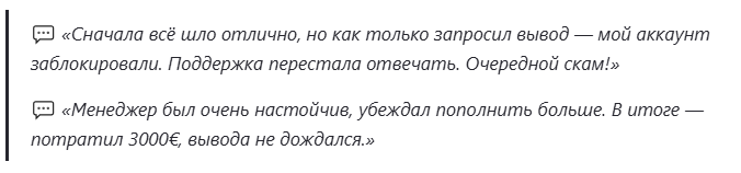 О tradeup net платформе обзор показал, что сотрудничать с данным брокером нельзя. Компания нигде не зарегистрирована и никем не регулируется. Более того, на сайте есть противоречивая информация и даже ложные сведения. «Трейд ап нет» платформа отзывы в сети успела собрать негативные, репутация у проекта плохая. Чтобы не попасть в ловушку скамеров, рекомендуем читать обзоры на нашем сайте.