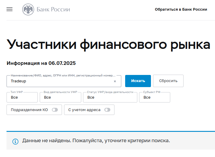 Платформа функционирует на русском и английском языке, соответственно, она должна регулироваться как на территории России, так и международными комиссиями. О наличии лицензии и отношений с регулятором на сайте ничего не сообщается. Мы проверили, зарегистрирована ли организация как участник финансового рынка в России, реестр Центробанка такого лица не содержит.