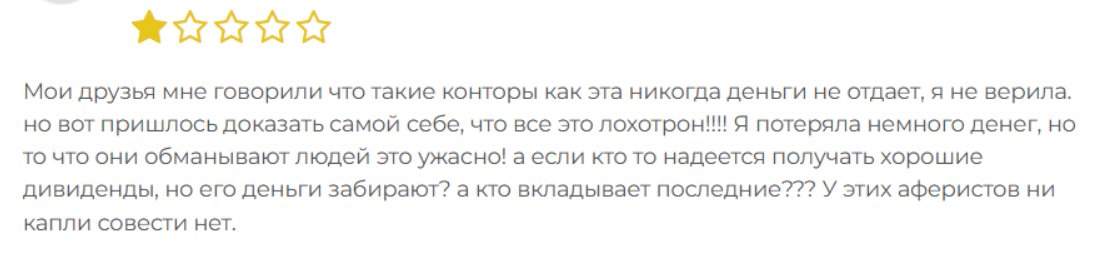 На сторонних ресурсах скопилось много негативных отзывов в отношении этой компании. Клиенты называют фейковой надежность брокера. Вкладчики пишут, что потеряли деньги. Они утверждают, что поддержка не отвечает, а при выводе финансов постоянно возникают сбои.