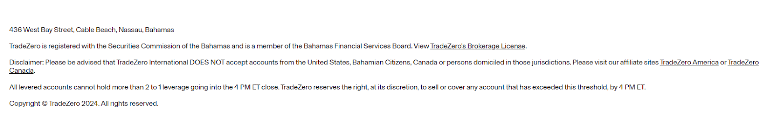 Брокер не раскрывает данные о своем капитале. Ничего неизвестно о торговых инструментах TradeZero co. Клиентам сообщается о том, что после регистрации необходимо внесение депозита на счет кошелька равного более 500 долларов. В этом случае при заключении сделки пользователю будет доступно кредитное плечо равное 1:6. Если трейдер вносит менее этой суммы, то кредитное плечо становится равным 1:1.