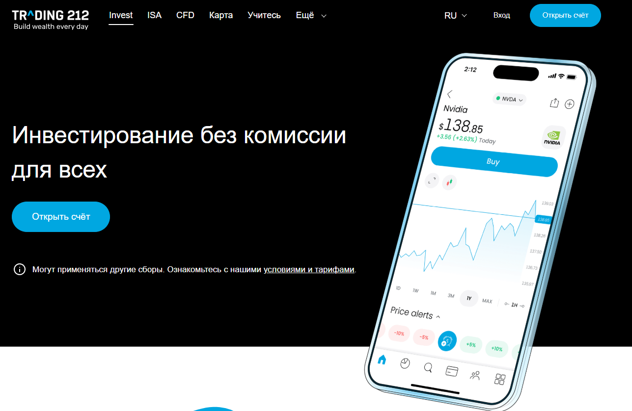 Встречает на сайте Trading212 com заявление о том, что инвестирование доступно всем без комиссии – это создатели площадки указали большими заметными буквами. При этом ниже более мелким шрифтом указано, что могут применяться некие другие сборы.
