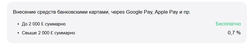Переходим в раздел с комиссиями и довольно просто разоблачаем обман. Да, на транзакции внутри площадки никаких сборов нет, однако даже на обычное пополнение средств свыше 2 тыс. фунтов уже применяется комиссия 0,7%. С выводом денег тоже должны выполняться определенные условия, хотя ранее абсолютно всем пользователям обещали отсутствие дополнительных переплат.