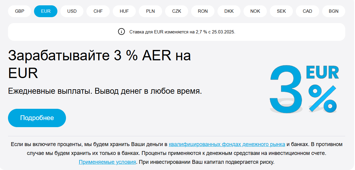 Инвестирование на Трейдинг 212 доступно в 13 валютах, причем везде процентная ставка разная. Для вкладов в EUR, например, доходность составляет 3%. Вот только непонятно, за какой именно период. Здесь отмечено, что выплаты происходят каждый день, однако это не означает начисление процентов с такой же периодичностью.