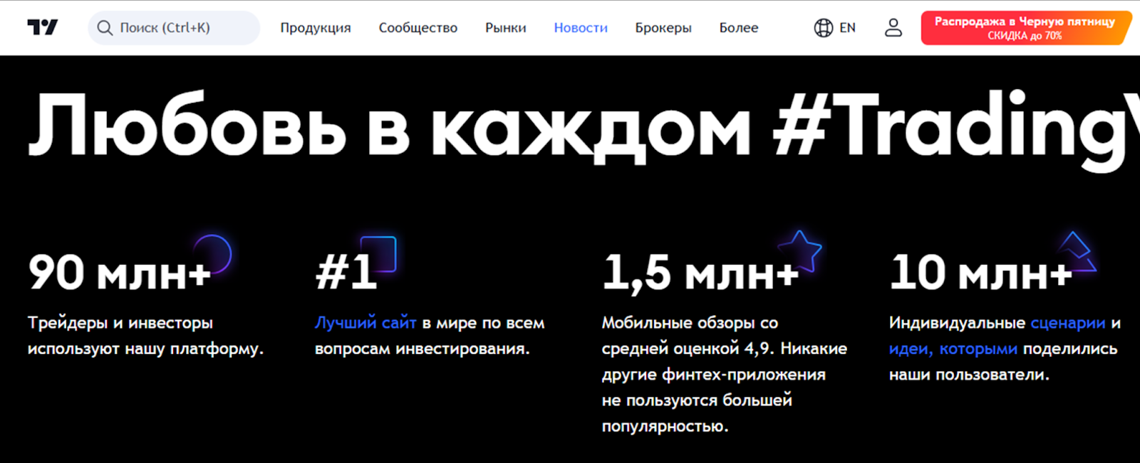 В описании сказано, что перед нами платформа для построения графиков и социальная сеть. По статистике, число ее пользователей перевалило за 90 миллионов, и это первый в перечне сайт по популярности среди трейдеров.