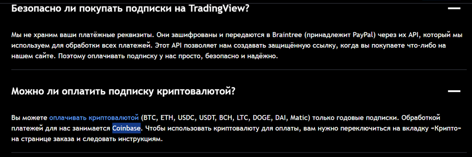 Оплатить подписку можно через платежную систему PayPal, заявлено, что все платежные данные хранятся именно на ее сервере, а не в системе Tradingviev pro. Есть возможность и оплаты криптой. Но в таком случае покупать придется сразу годовую подписку. Для платформы платежи обрабатывает известный сервис Coinbase, что также является плюсом в пользу безопасности проекта.