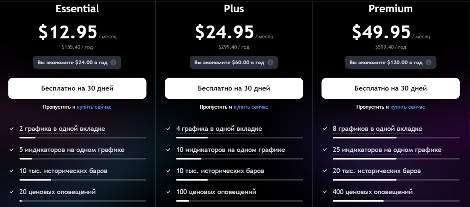 - Essential – цена подписки 12,95 евро в месяц. Доступно 7 индикаторов, 20 ценовых и 20 технических оповещений, возможность одновременного открытия 10 графиков.