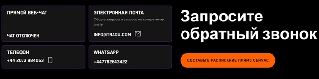 В разделе «Связаться с нами» указаны контактные данные биржи Tradu. Владельцы публикуют ссылку на веб-чат, который на сегодняшний день отключен. Адрес электронной почты info@tradu com является действующим. Любой желающий может запросить обратный звонок.